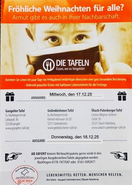 Gerne können Sie diese auch während der Ausgabezeiten in allen 5 Ausgabestellen unserer 3 Tafeln ausgeben, die Infos wann dies ist, finden Sie auf der Website der jeweiligen Gemeinde. Bitte kommen Sie möglichst vor dem Kundenansturm, d. h. am besten zwischen 10.00 Uhr und 12.00 Uhr. Oder Sie kommen am Mittwoch, den 17.12.25 da sind wir von 10.00 Uhr bis 18.00 Uhr vor Ort.